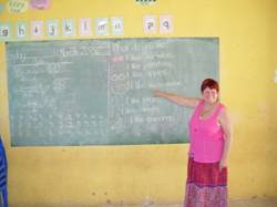 Under a tree she taught 18 children to read and write English. She also taught crafts and sewing so they could earn money.